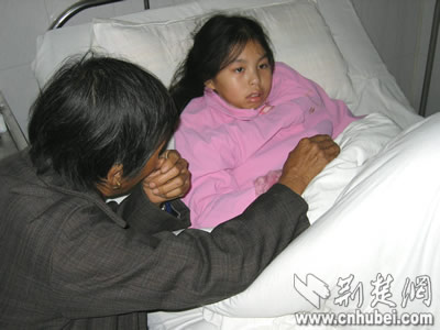 在縣人民醫(yī)院內三科9病房里,潔白的病床上躺著一個面色蒼白、嘴唇發(fā)烏的小姑娘,她就是楊青。在楊青艱難地望過來的時候,記者的心不禁打了個顫:大眼睛沒有一絲神采!記者反復醞釀的問候語哽在喉中。楊青的父母、奶奶、姑媽,卻忍不住悲傷,淚如雨下!皸钋啵阃床煌?”“痛……”楊青張了張嘴,聲音弱得幾乎聽不見!澳睦锿,告訴阿姨好嗎?”“全身都痛!睏钋囝澏吨鲁鲞@4個字后,不再開口說話。