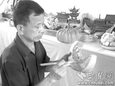 “老人家,這確實是用泡沫雕成的!比巳褐校叱鲆粋人。他是這個“冒牌貨”的生產(chǎn)者,特意帶著自己的“作品”,來菜場一顯身手的。
