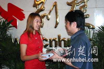 荊楚網(wǎng)副總編輯黃斌給孫小姐頒獎(jiǎng)