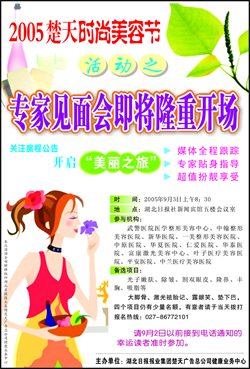 荊楚網(wǎng)消息(楚天金報(bào))2005楚天時(shí)尚美容節(jié)今起正式啟動(dòng),本集團(tuán)將聯(lián)合武漢各大時(shí)尚美容機(jī)構(gòu),為愛美時(shí)尚人士提供各項(xiàng)時(shí)尚美容“大餐”。