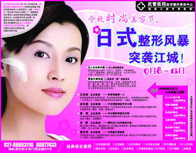 今日起,對光子嫩膚、割雙眼皮、隆鼻、除皺、豐胸、脫毛、文唇、美齒等時(shí)尚美容感興趣的讀者,可撥打電話027-86772101,報(bào)名參加“美麗之旅”,本集團(tuán)將組織專家篩選之后,為入圍讀者量身定做各種免費(fèi)美容體驗(yàn)項(xiàng)目;同時(shí),想詳細(xì)了解各種美容過程的讀者,也可報(bào)名參加,現(xiàn)場觀摩。報(bào)名活動(dòng)將持續(xù)到本周五。