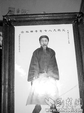 昨日,記者在湖北省社會(huì)科學(xué)院劉女士家中,見到了這塊漢繪瓷板畫。白色的瓷板鑲嵌在木制相框中,瓷板畫中間是一幅手工繪就的人像,畫中老人正襟危坐,含威不露,瓷板上端是“父親大人七旬晉四紀(jì)念”,右批為“民國二十七年孟春”,左批“男惟明制于漢口抗日軍次”,下端有“漢口榮康瓷業(yè)公司精繪”的小字(如圖)。
