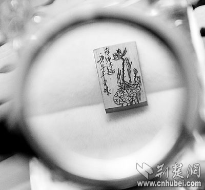 荊楚網(wǎng)(楚天都市報)(記者何君輝實習(xí)生周中華)寫意的中國山水畫,形態(tài)各異的花鳥蟲魚,憨態(tài)可掬的國寶大熊貓,風格迥異的詩詞……承載它們的,竟然是如米粒大小的象牙片或動物骨片。昨日,記者在微雕藝人童洪斌家中,手持放大鏡,領(lǐng)略了他的微雕絕活。
