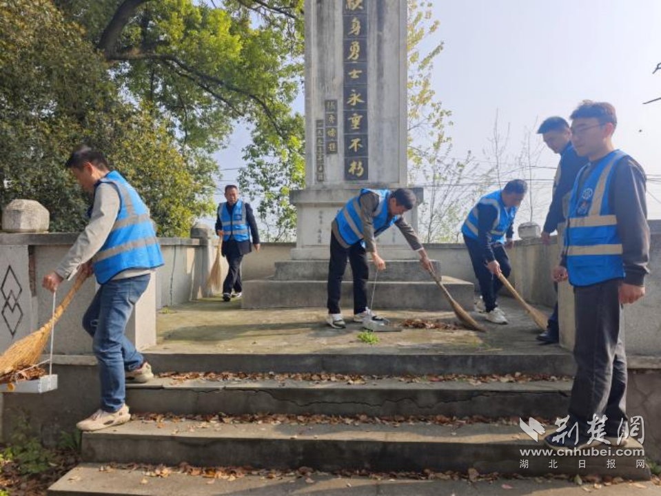 大家懷著崇敬的心情認真清理落葉雜物。通訊員供圖