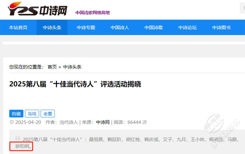 4月20日,2025第八屆“十佳當代詩人”評選活動揭曉評選結(jié)果塵埃落定,赤壁詩人歐陽明光榮上榜,這是赤壁詩人首次在該榜亮相。